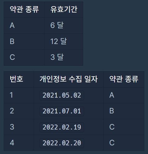 문제 설명 고객의 약관 동의를 얻어서 수집된 1~n번으로 분류되는 개인정보 n개가 있습니다. 약관 종류는 여러 가지 있으며 각 약관마다 개인정보 보관 유효기간이 정해져 있습니다. 당신은 각 개인정보가 어떤 약관으로 수집됐는지 알고 있습니다. 수집된 개인정보는 유효기간 전까지만 보관 가능하며, 유효기간이 지났다면 반드시 파기해야 합니다.예를 들어, A라는 약관의 유효기간이 12 달이고, 2021년 1월 5일에 수집된 개인정보가 A약관으로 수집되었다면 해당 개인정보는 2022년 1월 4일까지 보관 가능하며 2022년 1월 5일부터 파기해야 할 개인정보입니다.당신은 오늘 날짜로 파기해야 할 개인정보 번호들을 구하려 합니다.모든 달은 28일까지 있다고 가정합니다.다음은 오늘 날짜가 2022.05.19일 때의 예시입니다.