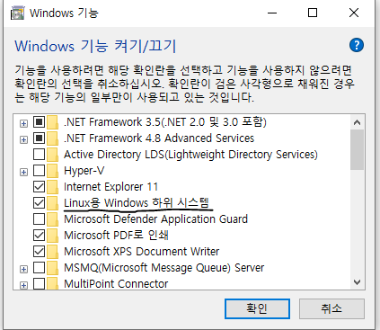 "Linux용 Windows 하위 시스템", "Windows 하이퍼바이저 플랫폼" 을 활성화한다.