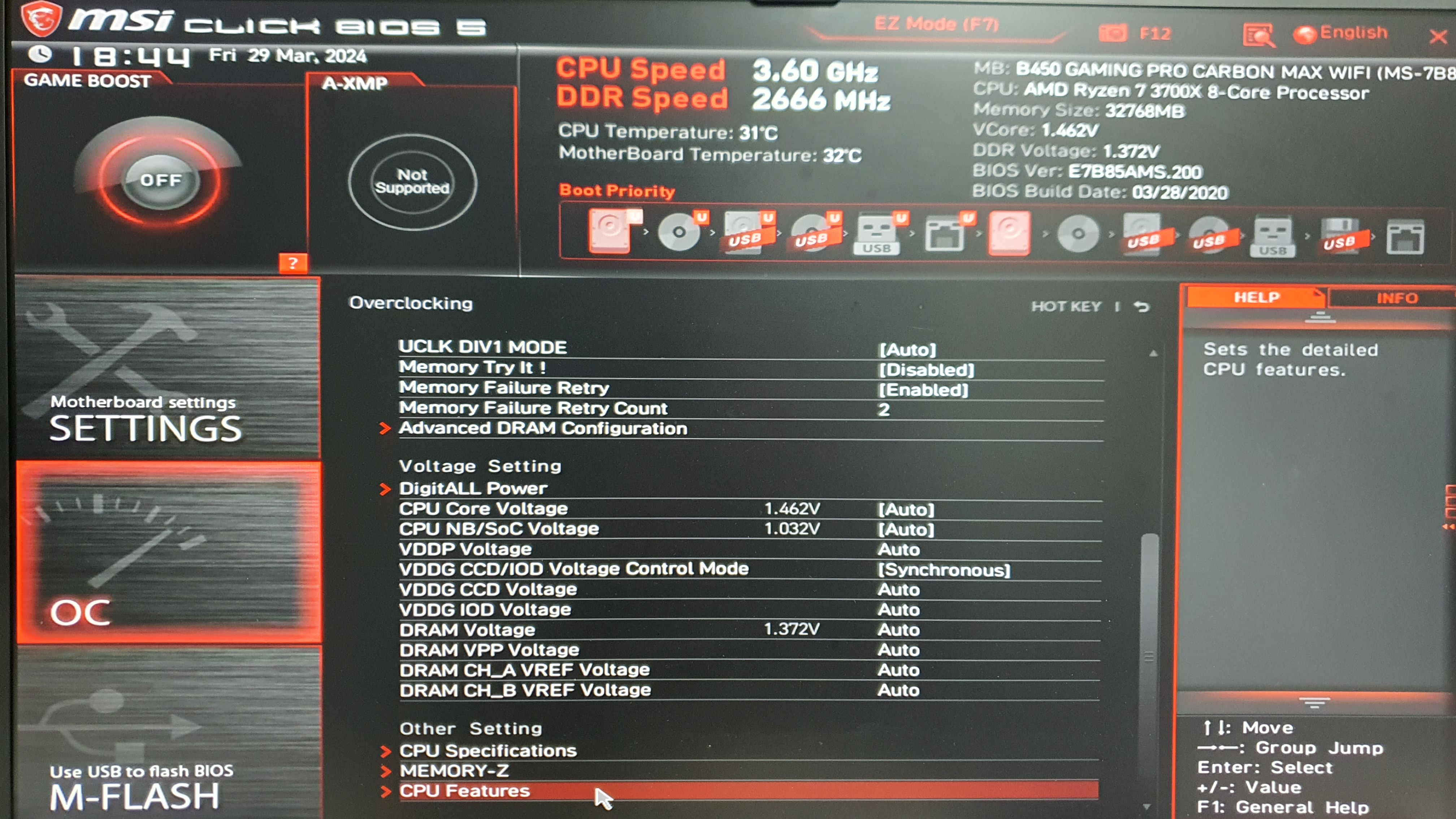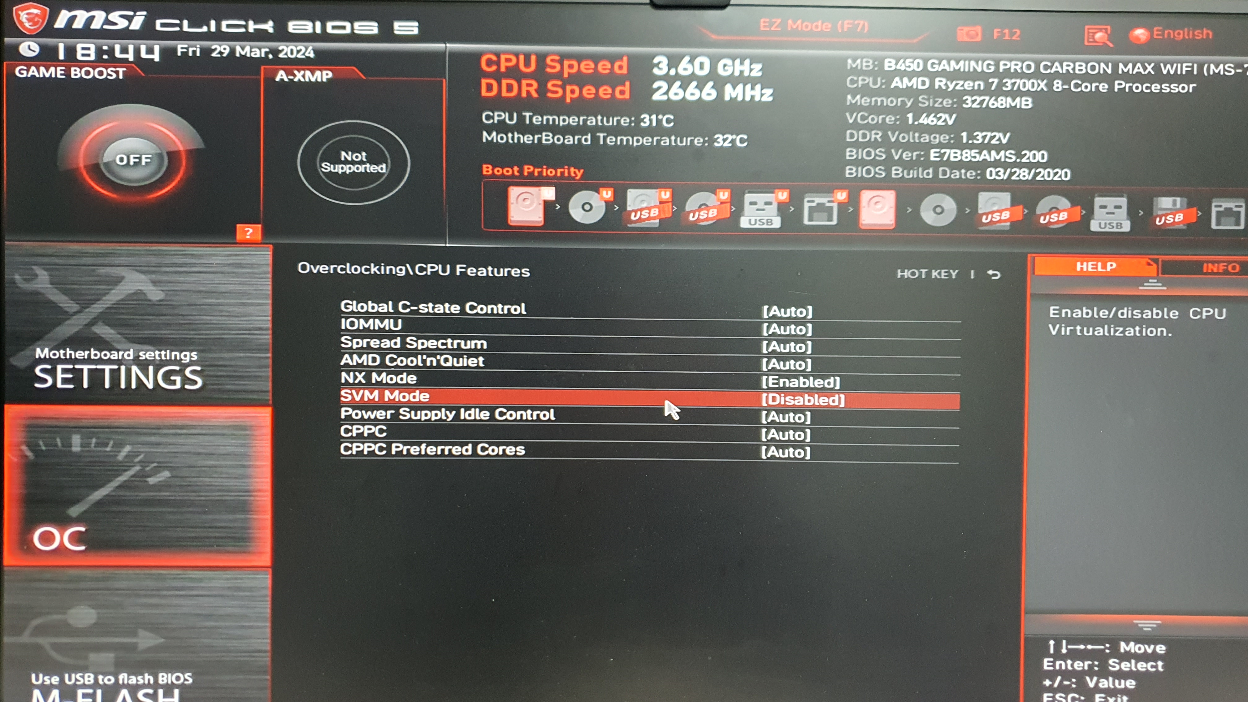 하단으로 내려가 CPU features 접속 → SVM Mode 활성화