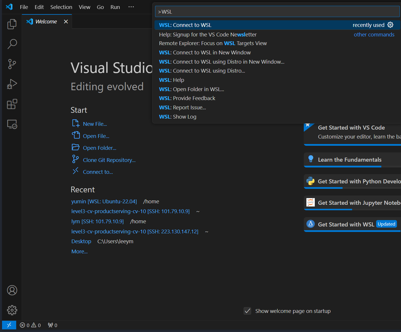 VScode에서 F1을 눌러 검색창을 연 뒤 WSL:Connect to WSL를 검색하여 실행한다.