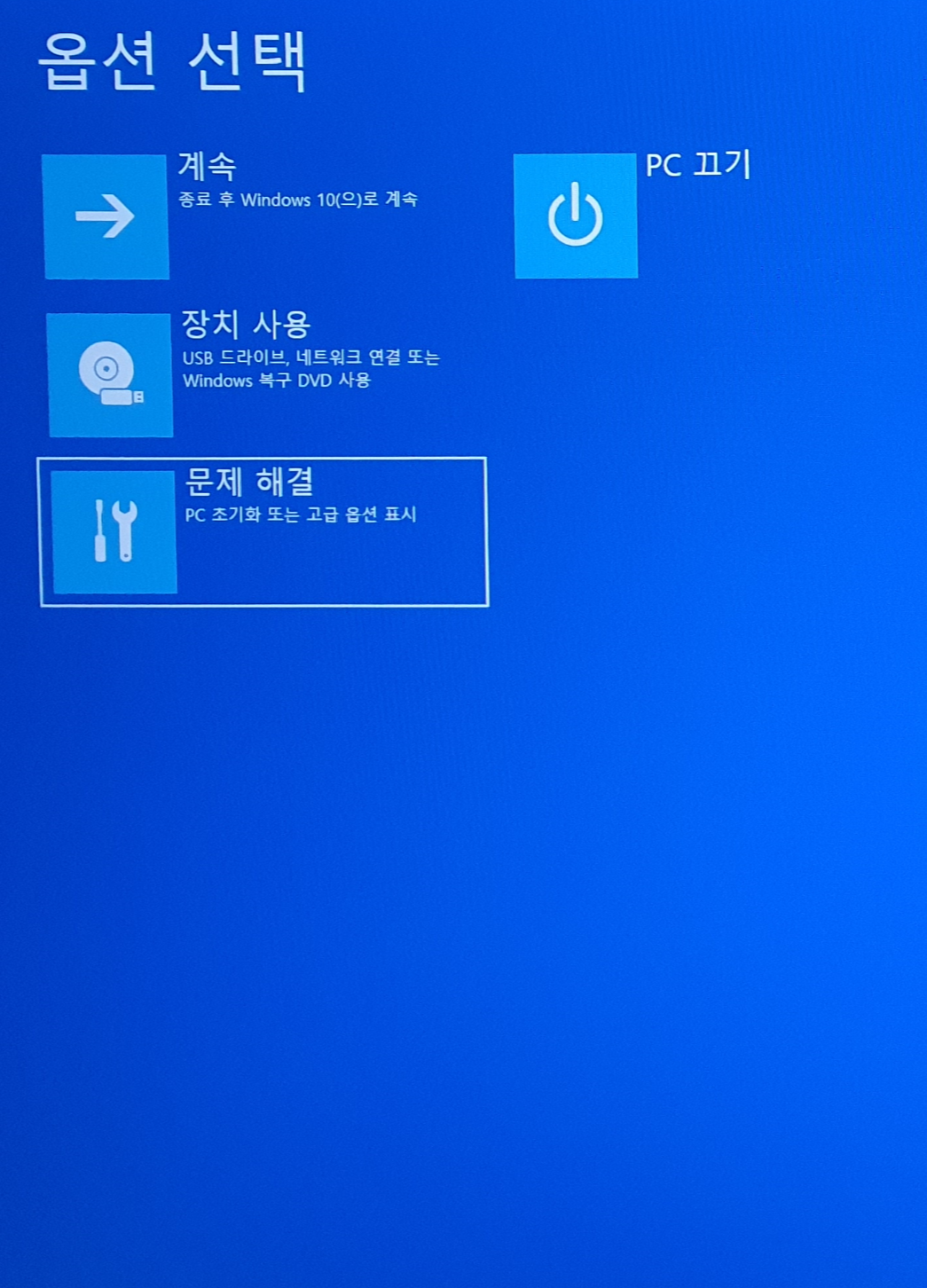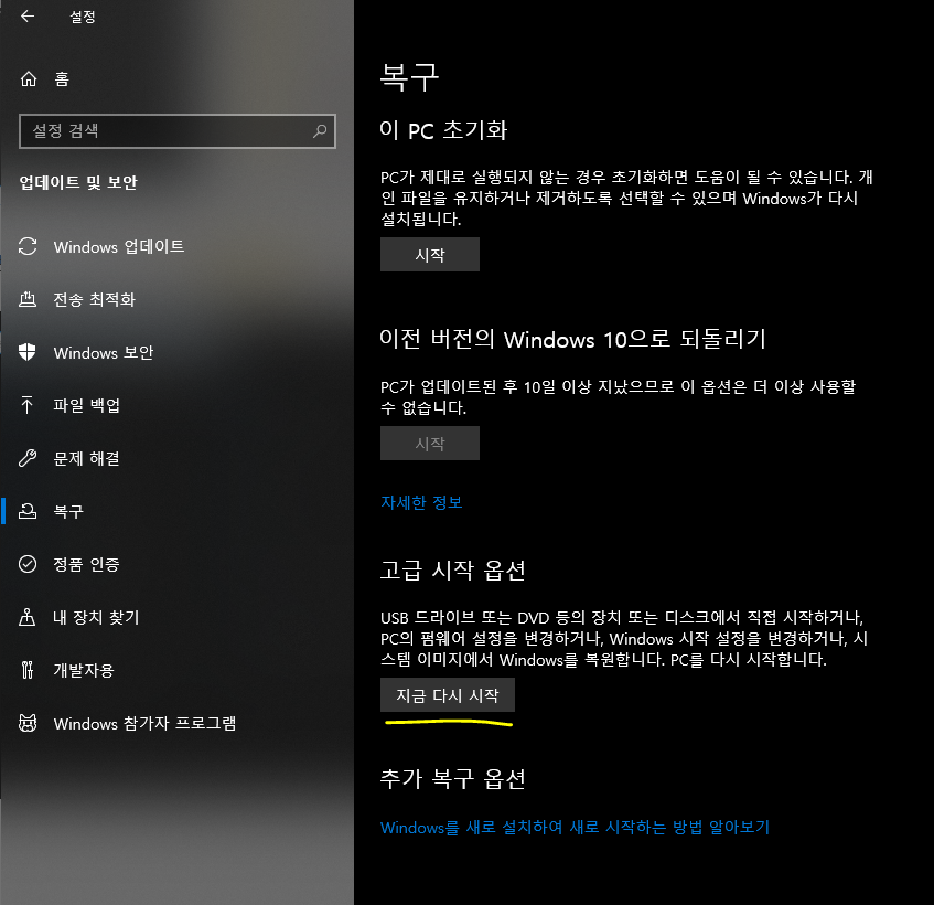 설정→업데이트 및 보안 → 복구 → 고급 시작 옵션 에서 지금 다시 시작을 해준다