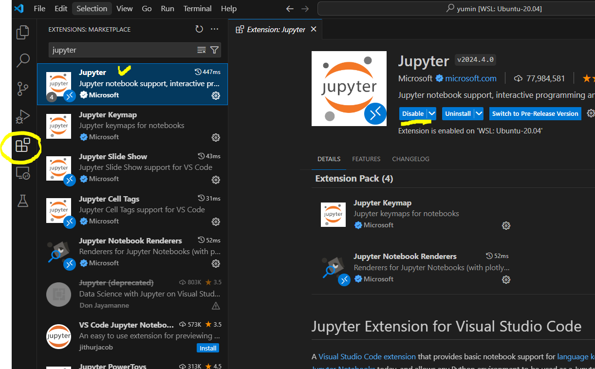 왼쪽 extention 설치하는 탭에서 jupyter를 따로 설치해주도록 하자.