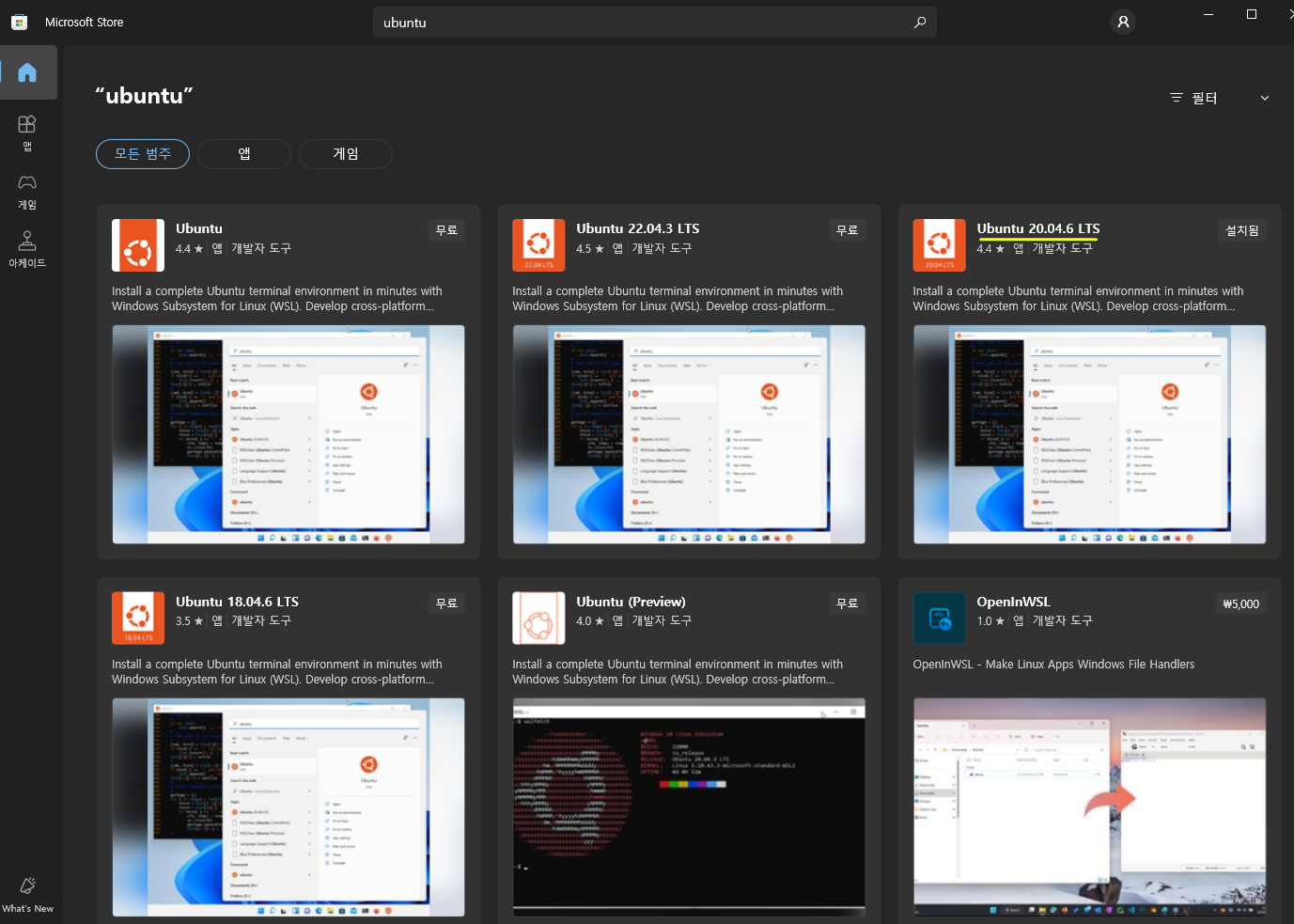 window 검색으로 Microsoft Store에 접속 → Ubuntu 20.04 를 설치