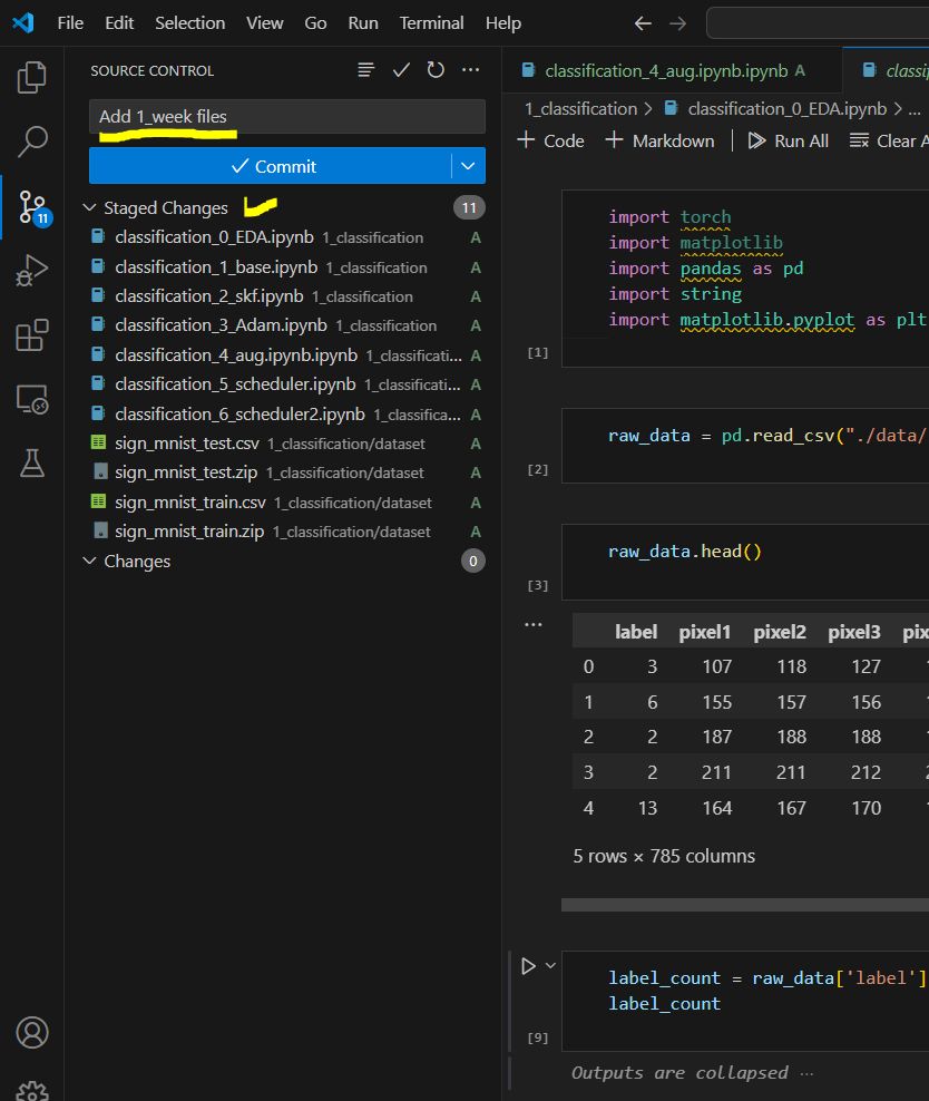 이번엔 데이터셋이 작아서 모두 올렸지만 깃 commit을 할 때 너무 큰 용량은 오류가 나버려서 꽤나 고생할 수도 있다.